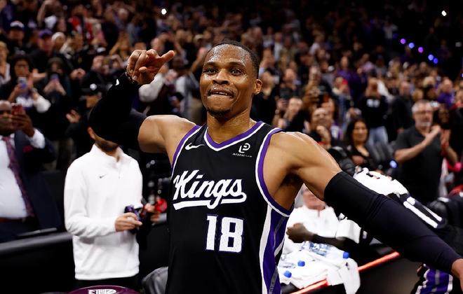 国王队这边,威少苦战41分钟,16投10中,三分3中2、罚球4中2空砍24分13篮板14助攻2抢断1盖帽的三双数据;拉文得到16分2篮板3助攻5失误;德罗赞贡献20分5篮板3助攻1抢断。